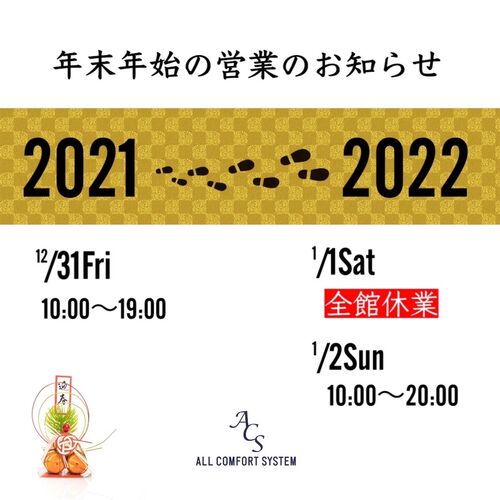 皆様、こんにちは! 玉川店、三澤です。 ここ数日、急激にさらに気温が下がり、大晦日はまた寒波がきているようですね・・・。 年末年始、お出かけの方は、お気をつけくださいませ。 さて、オールコンフォートシステム玉川高島屋S・C店、 年末年始の営業時間…